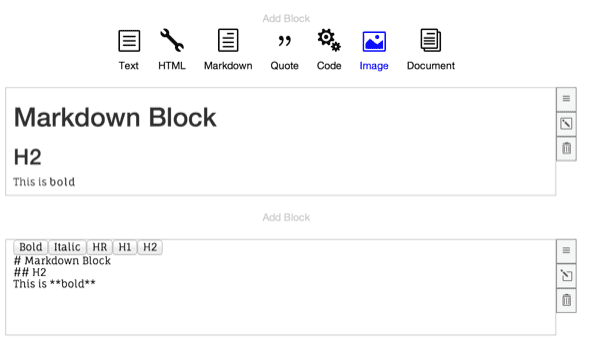John Lynch (@johnrlynch) created Makona, a block-style document editor for the web. Blocks of different content types comprise documents, authored using plain markup. At the switch of a toggle, block contents are then rendered on the page. While not quite a WYSIWYG editor, Makona uses plain textareas for input. This makes it compatible with a wider range of platforms than traditional rich text editors. makona editor